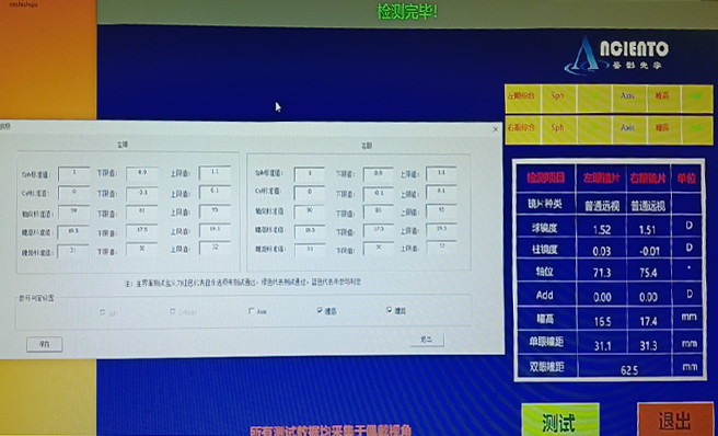 设备特点 1. 范围大:满足从-13D~+10D检测范围。 2. 精度高:度数精度:0.01D,瞳距瞳高精度:0.2mm(1D以上)。 3. 功能全:球柱镜度,轴位、ADD、瞳距、瞳高等功能。 4. 通用性强:适用单光、渐进片、镀膜车房片。 5. 速度快:综合测试:小于15S。快速模式,小于10S。 6. 生成报告:可生成检测报告。